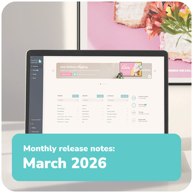 Development Updates Monthly release notes – March 2026 Apr 7, 2026 10:15:36 AM Our software grows with you – for you. Fusion Signage is built by those who use it. Yeah, that's you... Keep reading